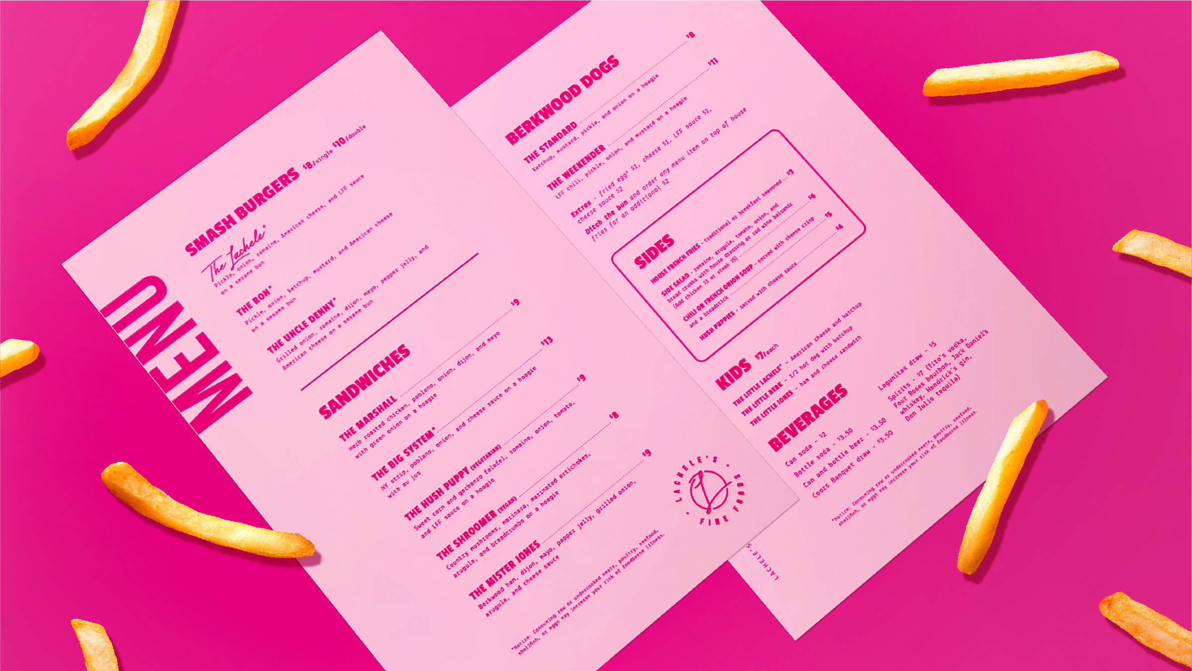 Lachele’s Fine Foods, a new restaurant in Des Moines, Iowa specializing in their signature smash burger, needed a brand identity to help tell their story. Lachele’s retro diner influence brings home the local feel while using typography and other design elements to match the craft of their elevated food offerings. The brandmark was inspired by Lachele’s signature, herself, and the care that goes into everything on the menu.
